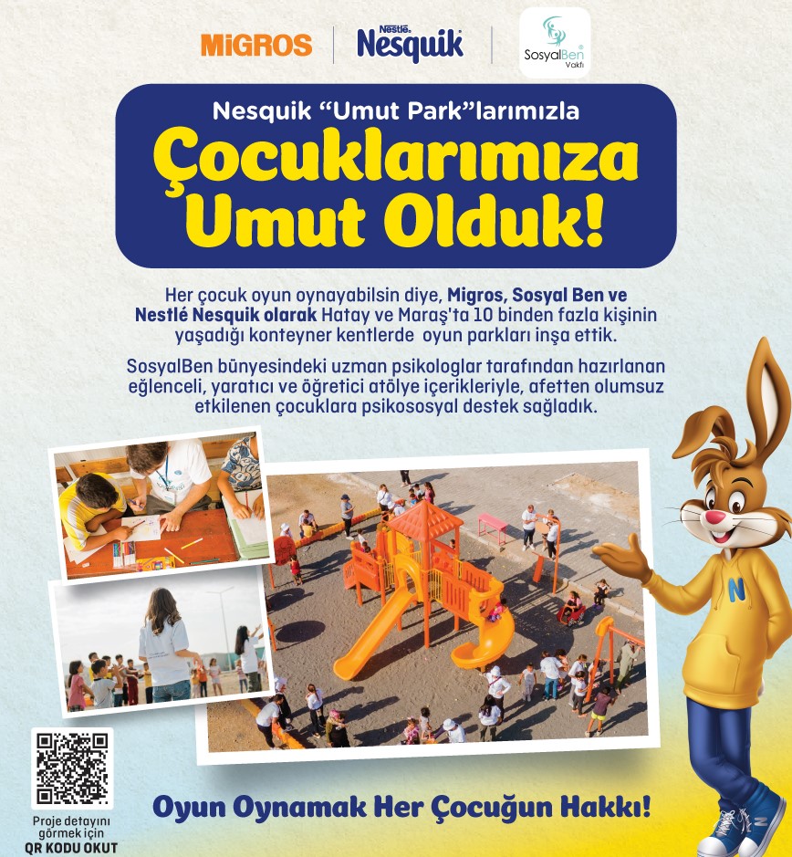 Nesquik ve SosyalBen Vakfı ile Umut Parkı Projesi: 2024 yılında Nestlé Nesquik, SosyalBen Vakfı ve Migros iş birliğiyle depremden etkilenen çocuklara yönelik Hatay ve Kahramanmaraş'ta Umut Parkı projesi hayata geçirilmiştir. Migros tarafından Beceri Gelişim Merkezi (BEGEM) bünyesinde yer alan Oyun Atölyesi sahiplenilmiştir. Proje kapsamında kurulan oyun parklarında düzenlenen eğlenceli, yaratıcı ve öğretici atölyelerle çocuklara psikososyal destek verilmiştir. Profesyonel eğitmenler eşliğinde gerçekleştirilen bu etkinliklerde, çocukların deprem sonrasında yaşadıkları travmaların hafifletilmesi ve sosyalleşmelerinin sağlanması amaçlanmıştır.